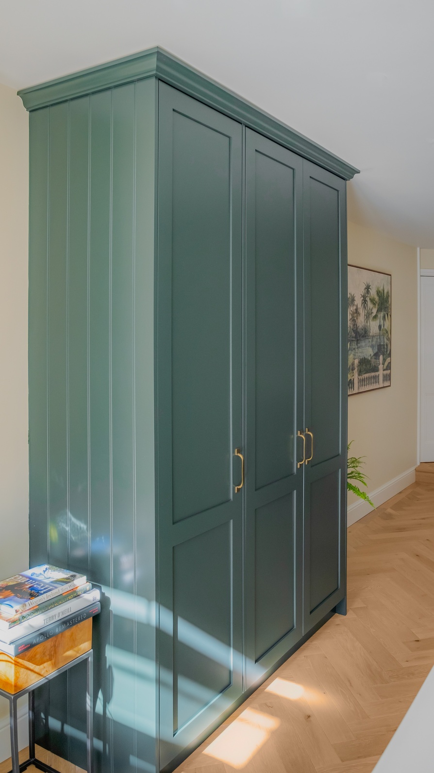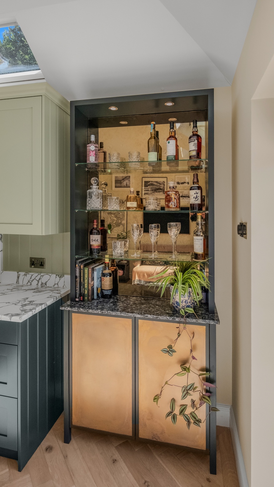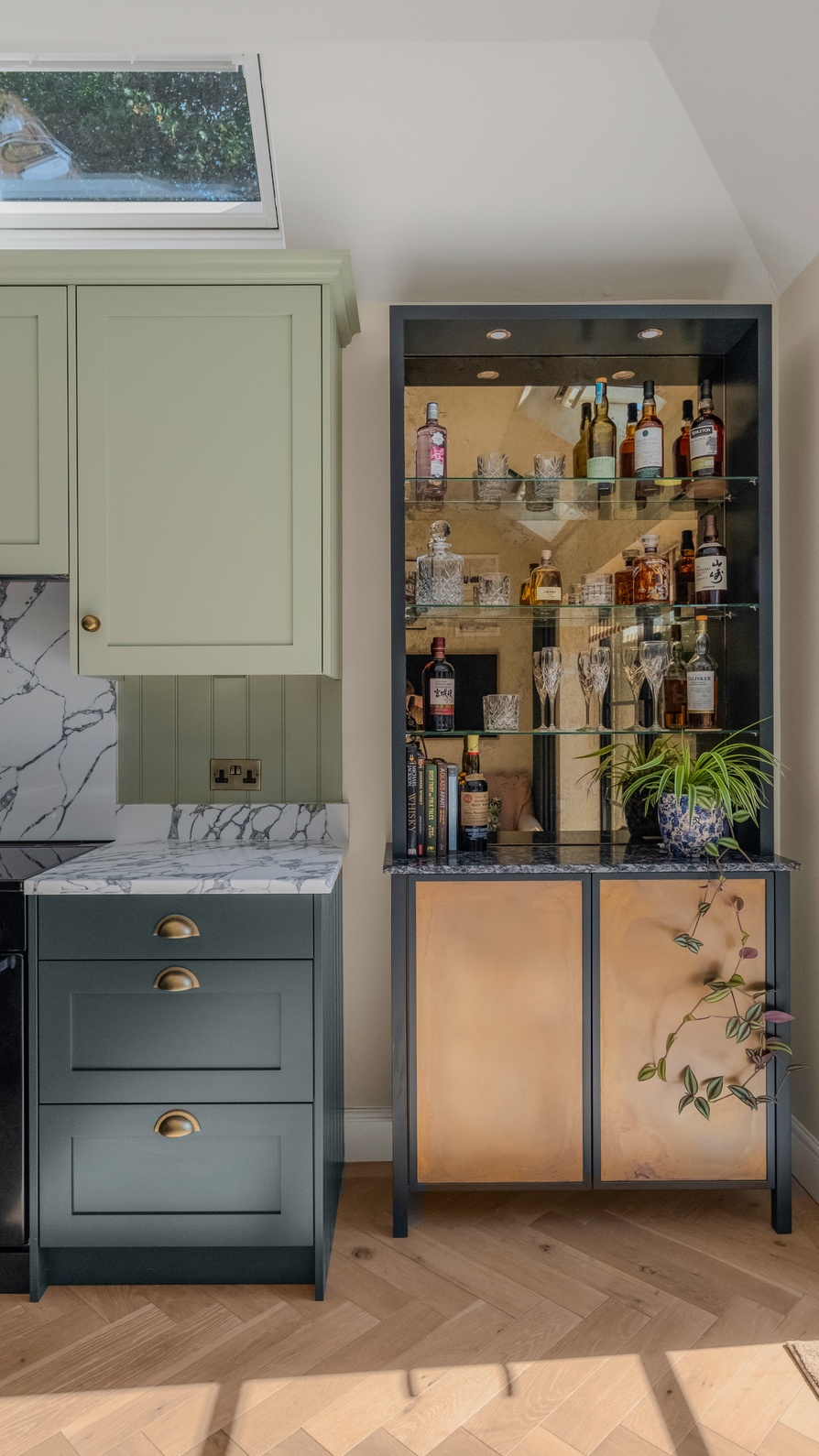 A later addition, the bar, was a personal request from the family and has become a striking feature in its own right. Designed as a space for entertaining and displaying beautiful bottles and glassware, it features hand-coated metal doors and the same antique brass accents found in the kitchen, tying the two areas together seamlessly.