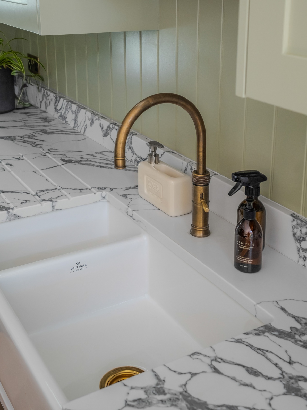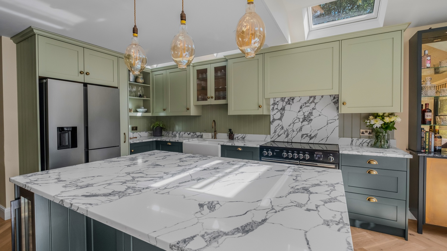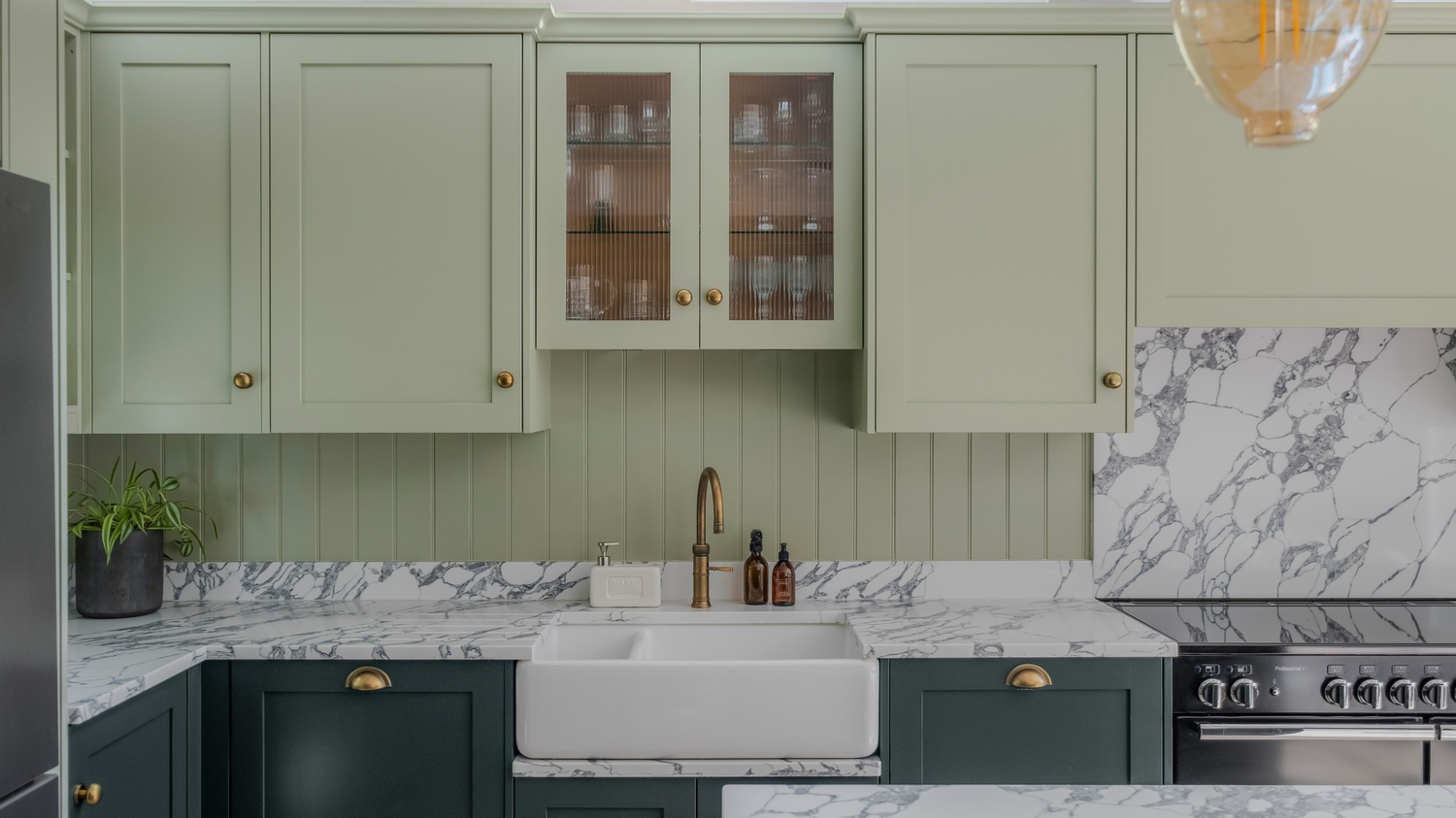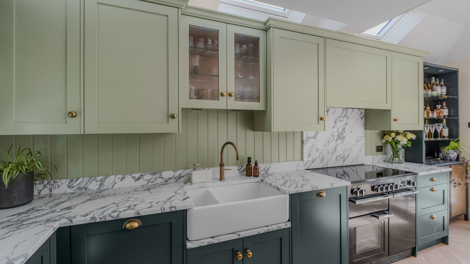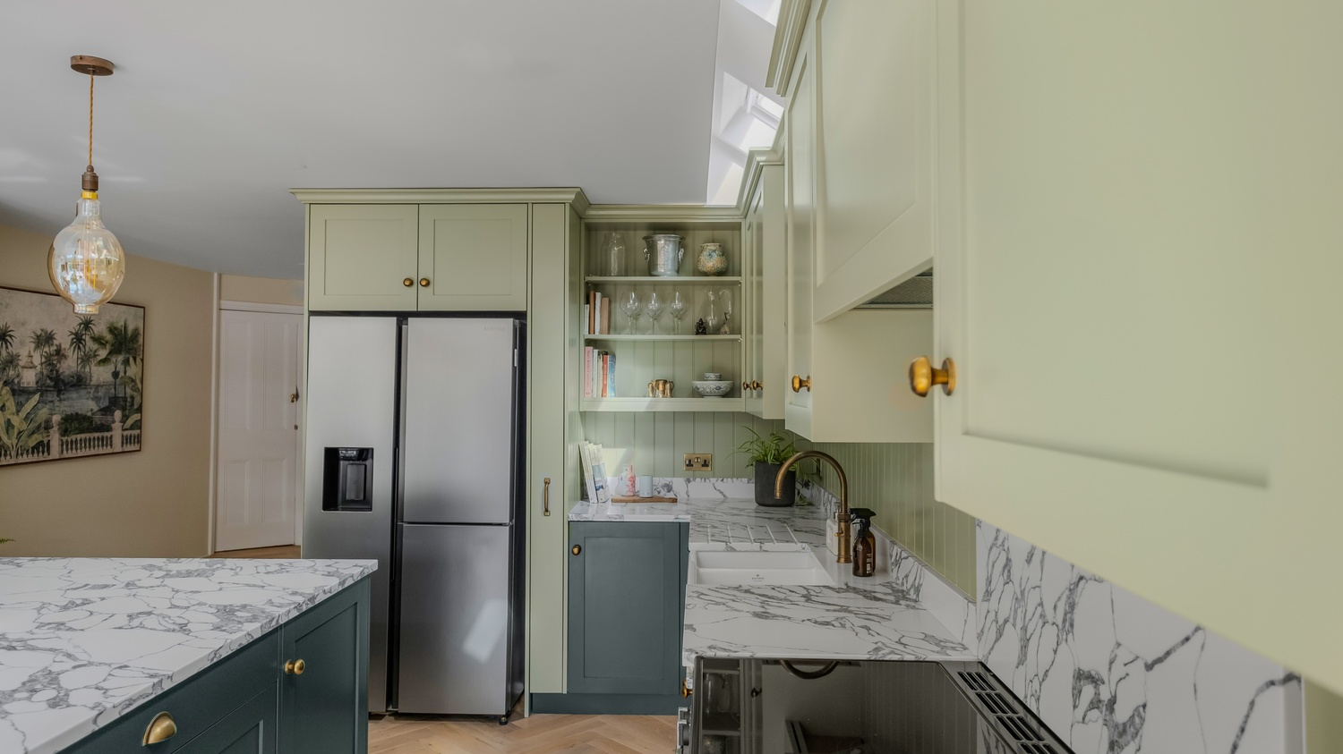 This bespoke shaker kitchen in East Sheen combines timeless style with practical family living. The soft two-tone green cabinetry is paired with a striking quartz worktop, creating a sophisticated backdrop that feels both warm and contemporary. A Belfast sink sits beneath a reeded glass wall unit, while the Quooker tap in antique brass adds a subtle touch of luxury. These details are echoed throughout the kitchen, giving it a sense of cohesion and thoughtful design.