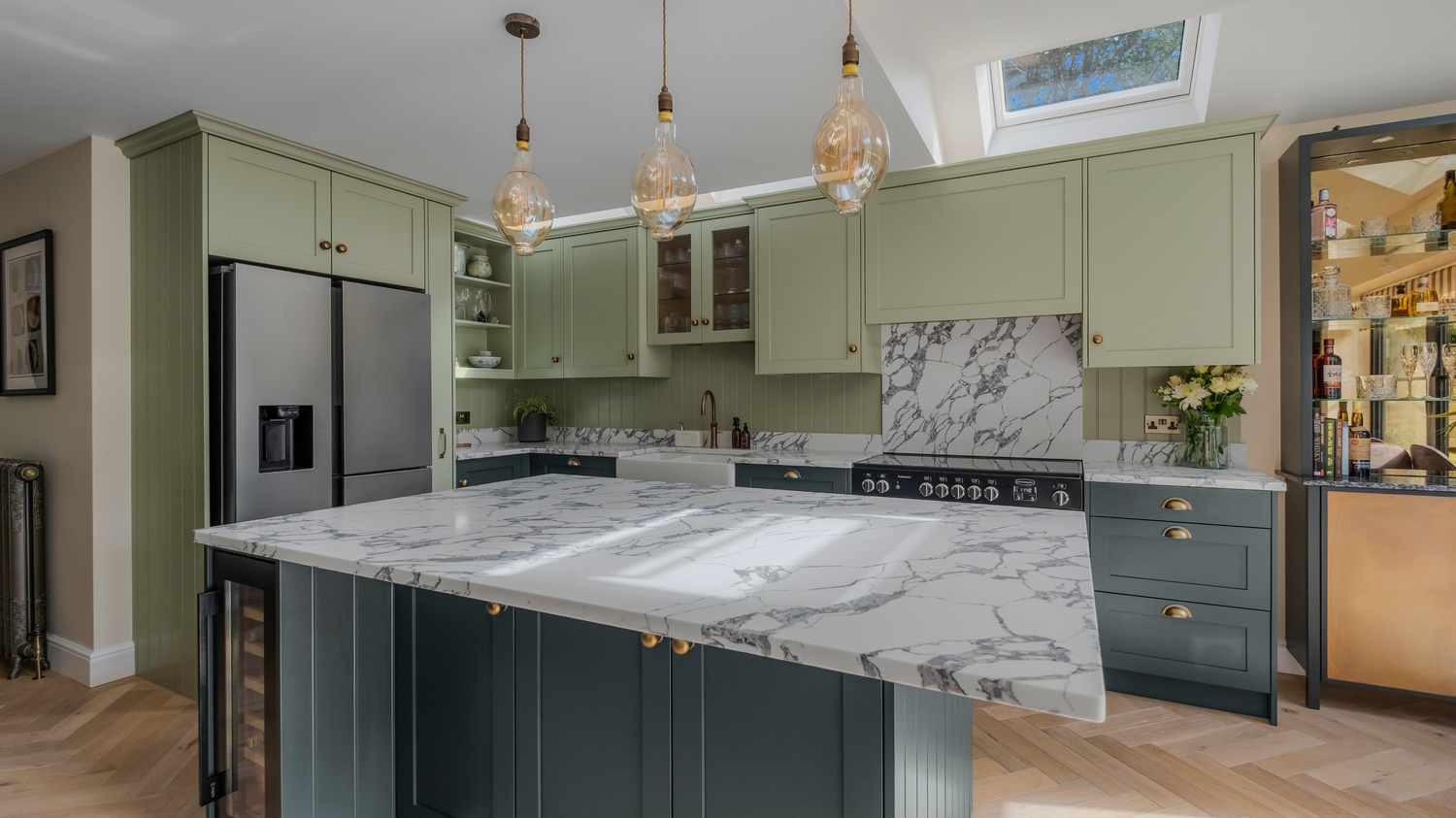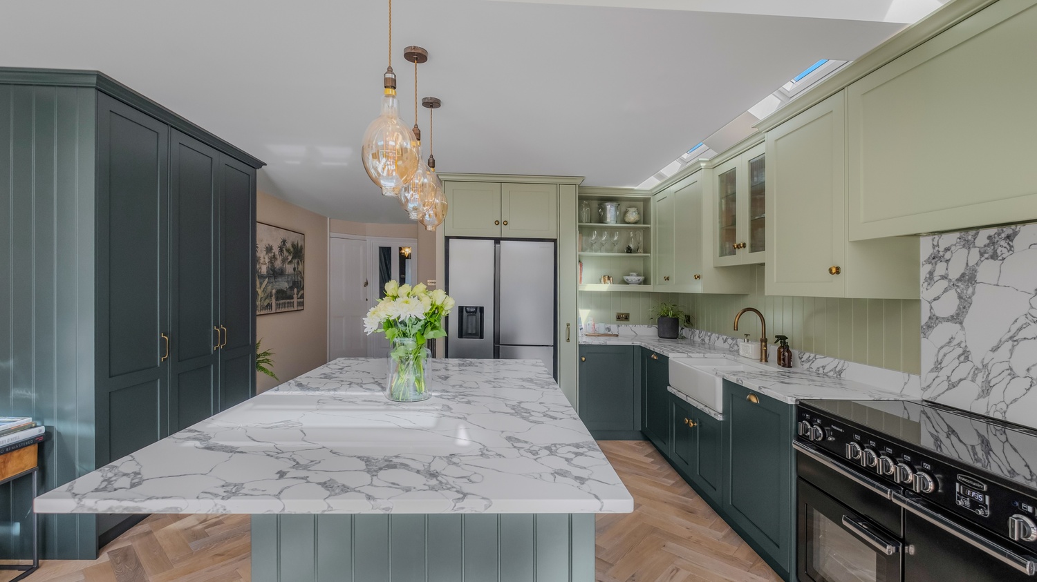 Two-tone green cabinetry that feels both warm and contemporary.