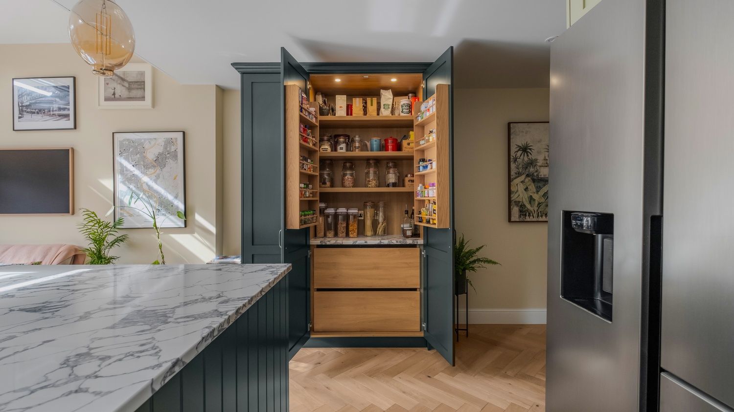 At the heart of the space, a large island provides seating for five, making it the perfect hub for family life. Its return cleverly incorporates a spacious larder, which the homeowner describes as indispensable for managing her busy household, alongside a discreet broom and storage cupboard. Beyond the main kitchen, a matching utility room houses a double-stacked washing machine and sink, combining style with everyday practicality.