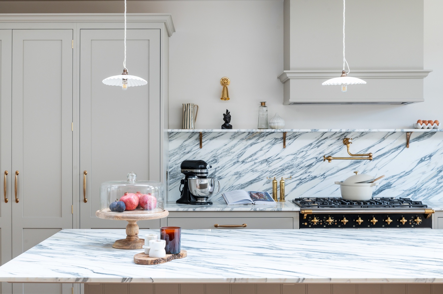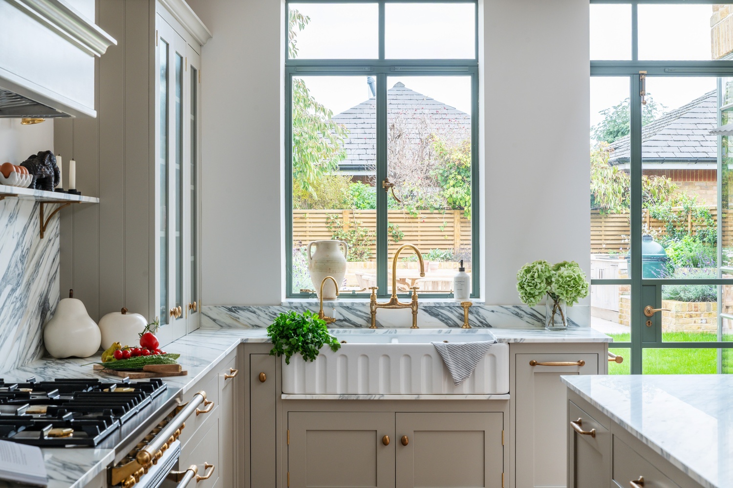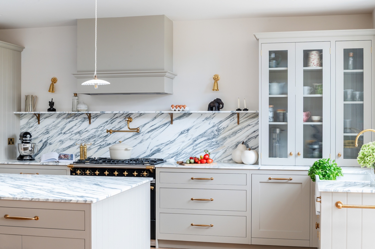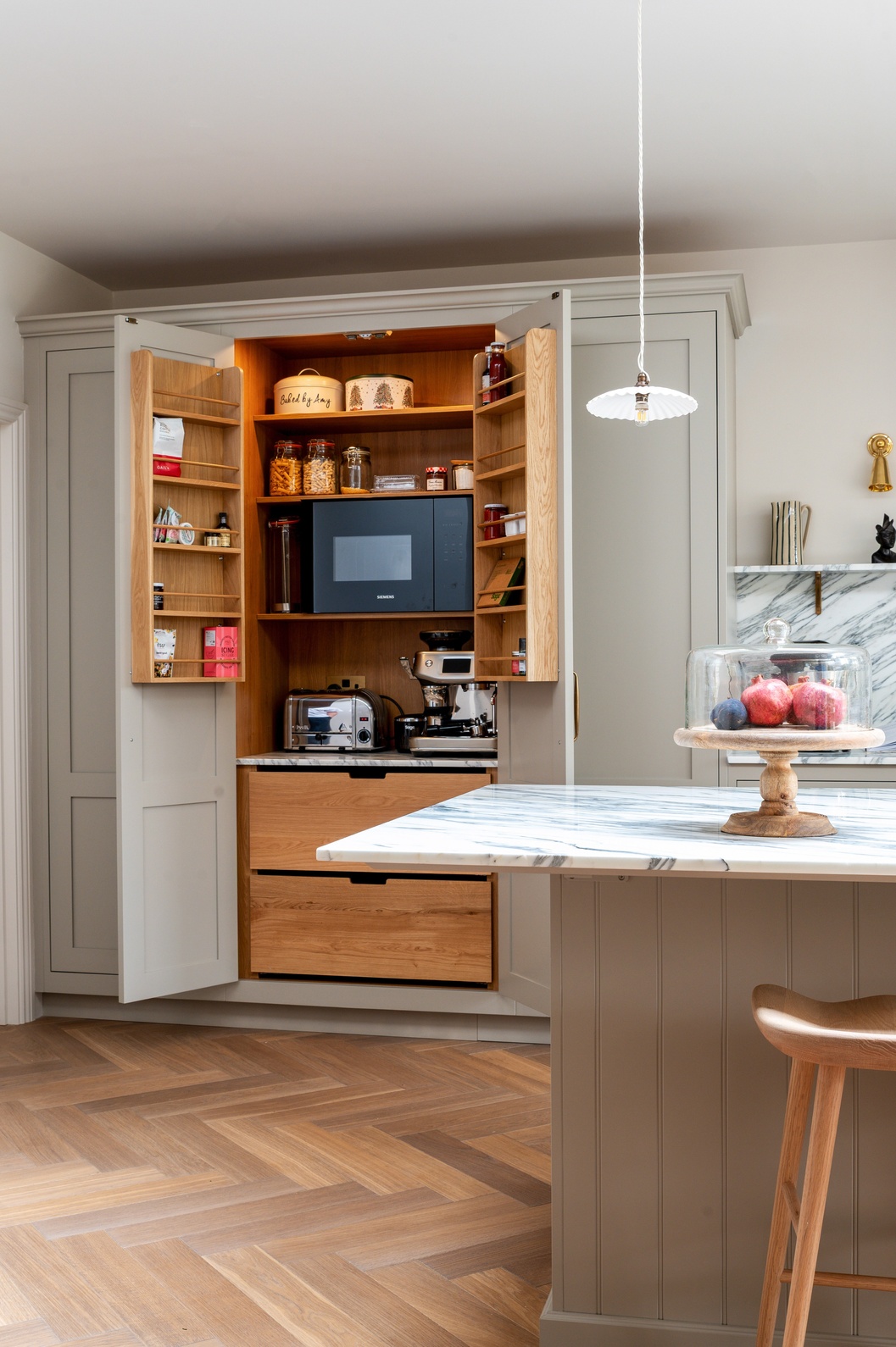 Rather than one single “star” feature, several elements capture attention throughout the space. The Lacanche range cooker, double fluted Belfast sink, and veined marble surfaces immediately draw the eye, while the bar area and clever storage solutions add both practicality and elegance. The mushroom-toned paintwork ties everything together, completing a kitchen that is as functional as it is beautiful.
