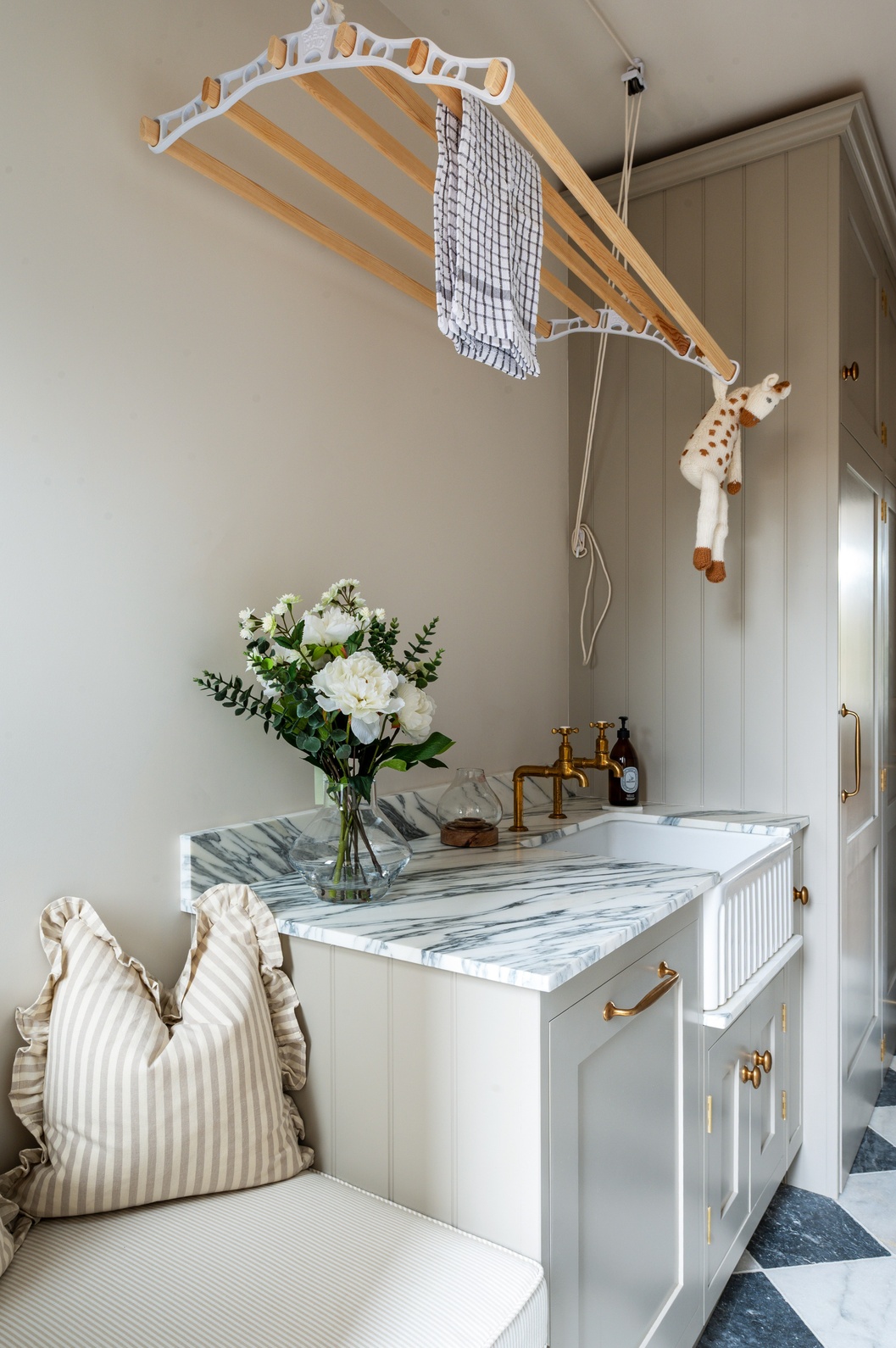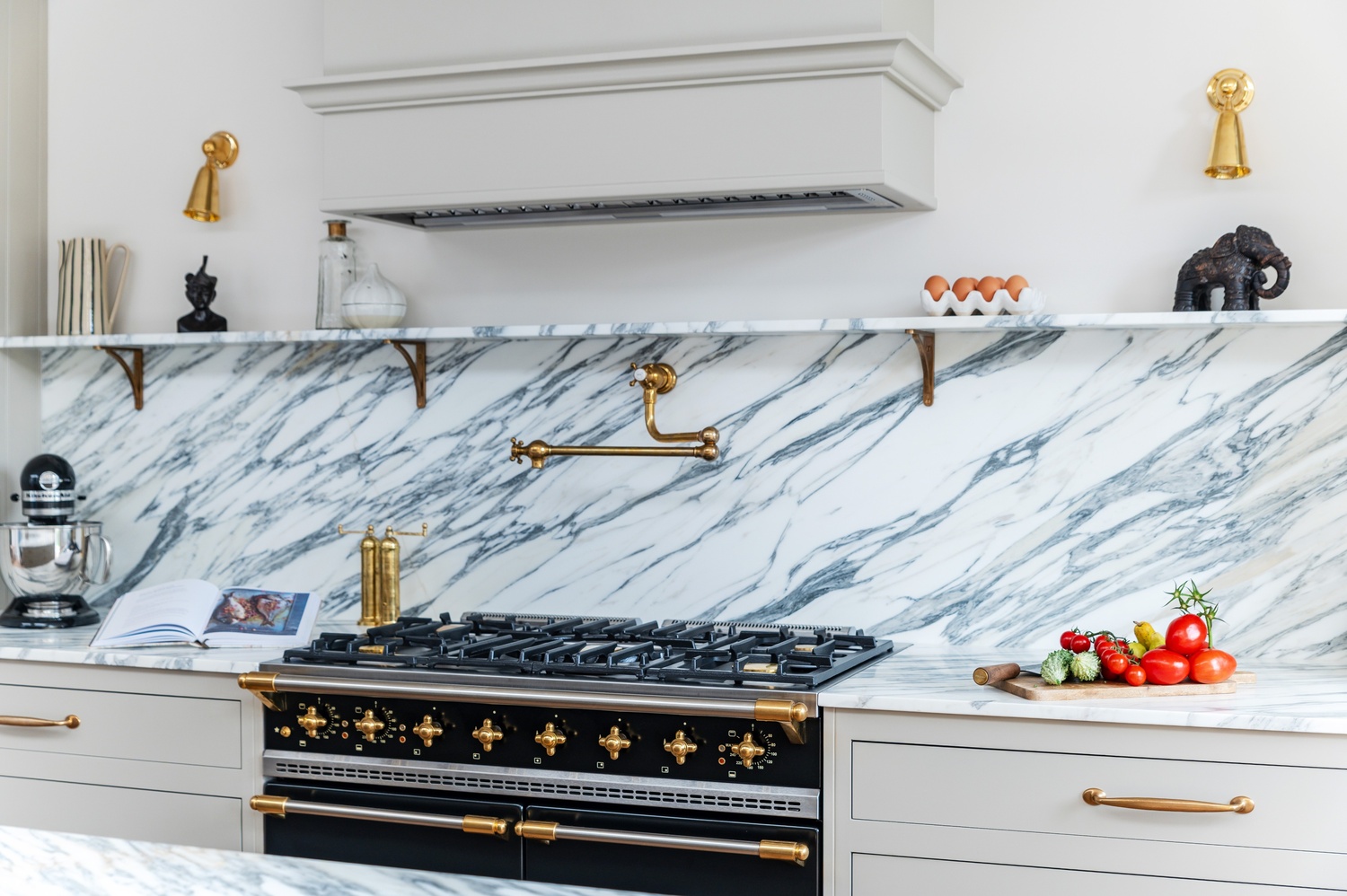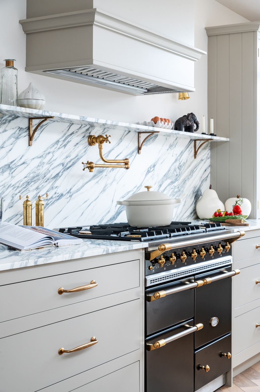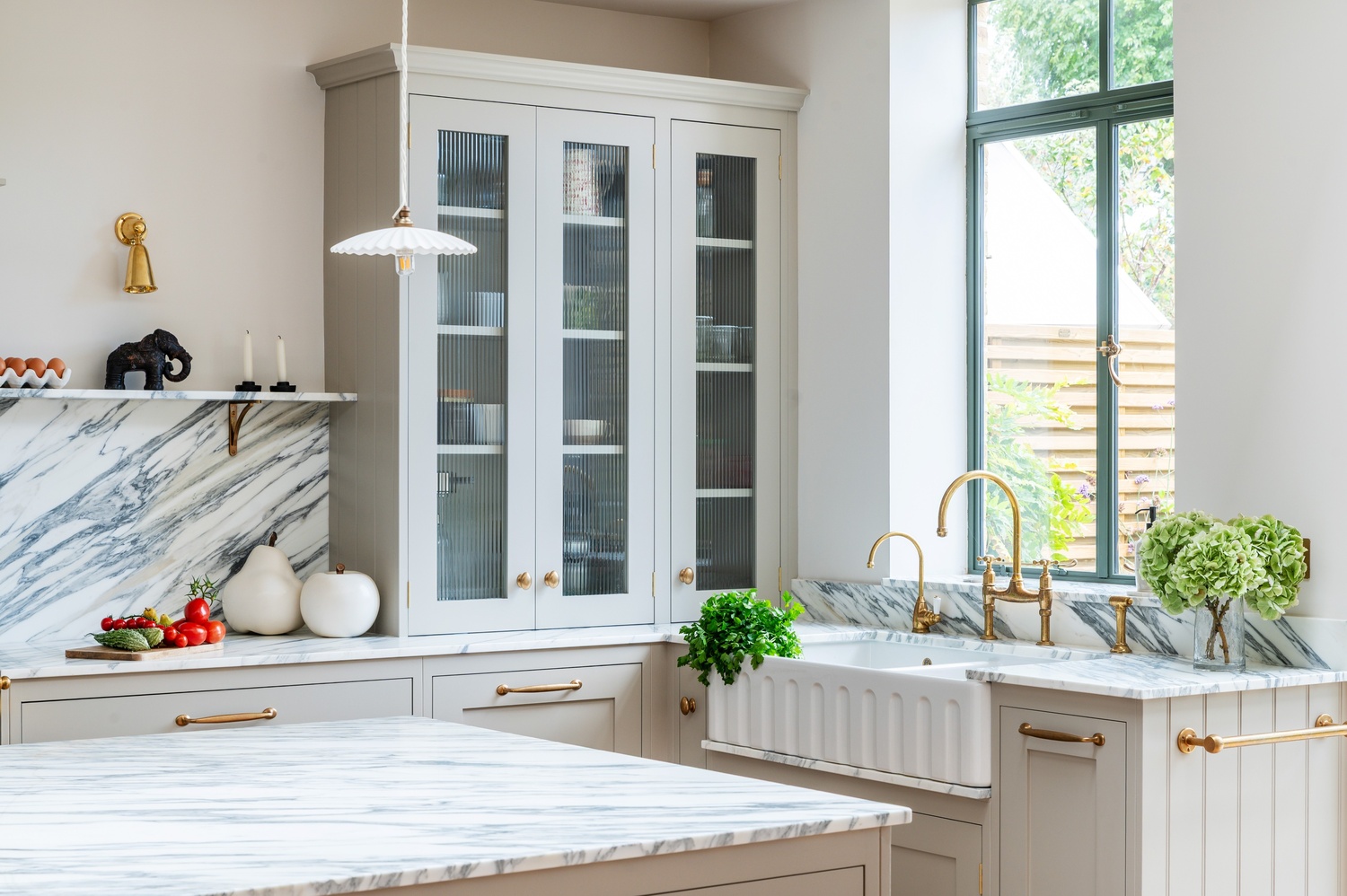 Rather than one single “star” feature, several elements capture attention throughout the space. The Lacanche range cooker, double fluted Belfast sink, and veined marble surfaces immediately draw the eye, while the bar area and clever storage solutions add both practicality and elegance. The mushroom-toned paintwork ties everything together, completing a kitchen that is as functional as it is beautiful.