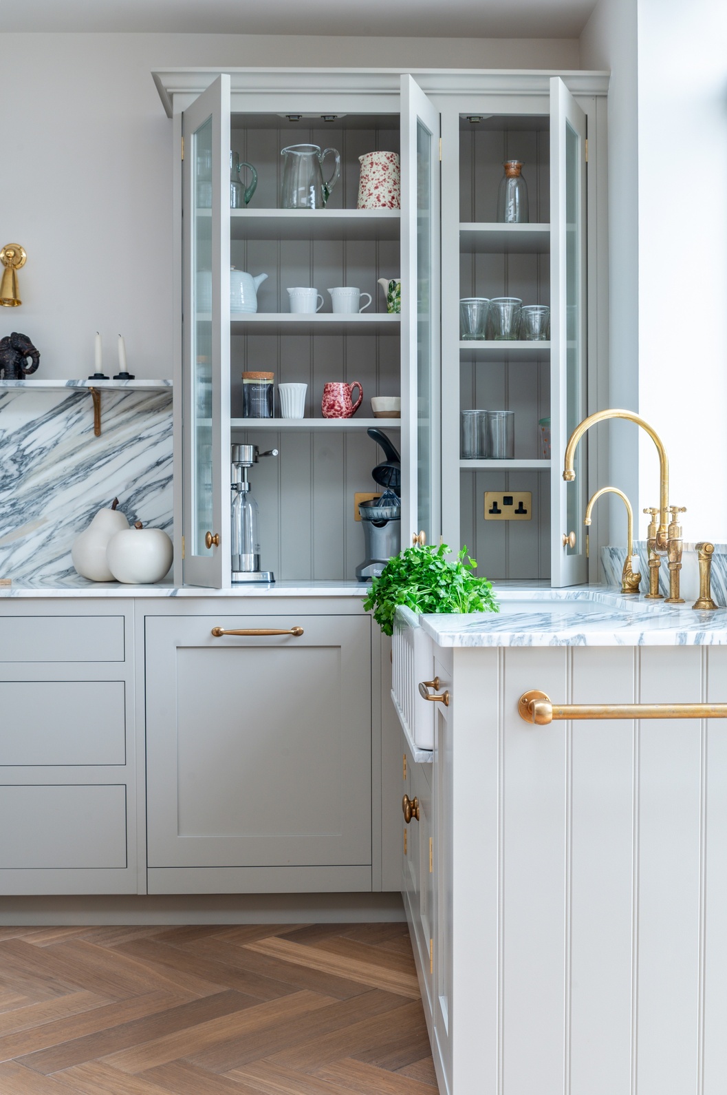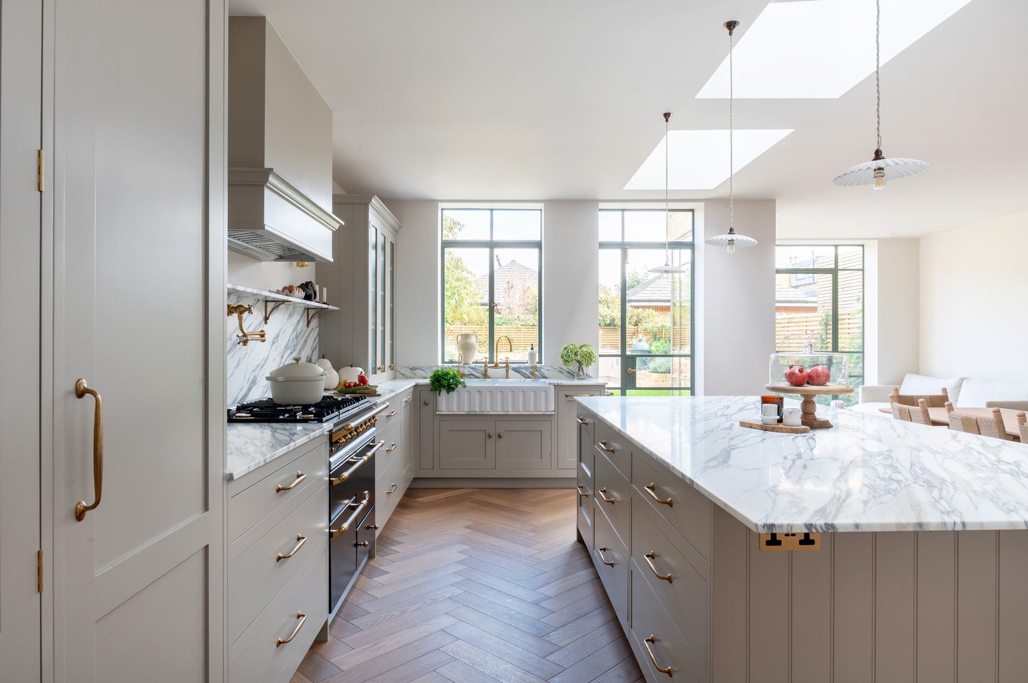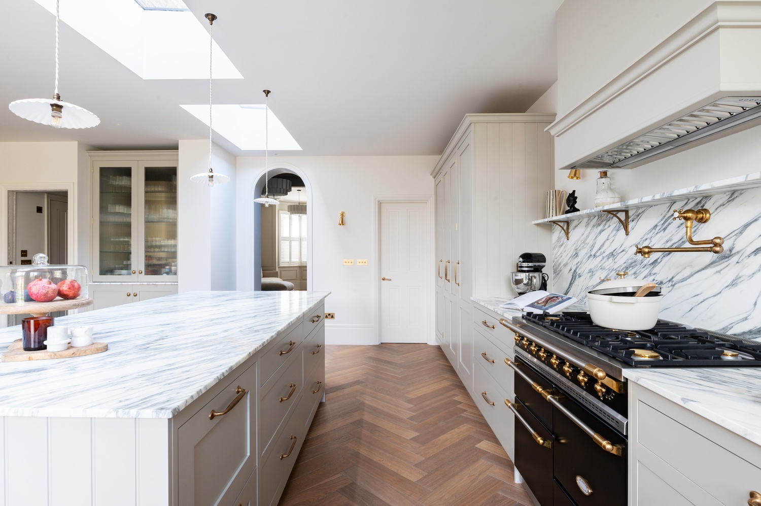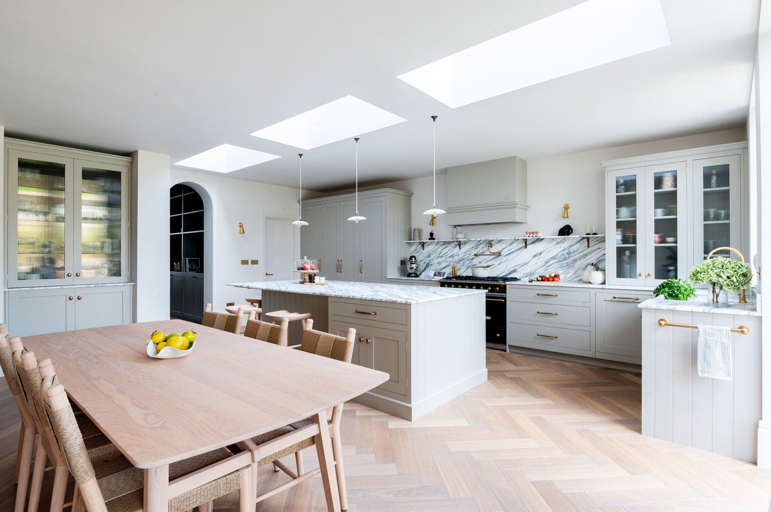 Every material and product was chosen to strike the perfect balance between tradition and contemporary living. After guided visits to our showroom and to Culliford Stone Yard, the clients fell in love with the Arabescato Corchia marble worktops. The elegant veining pairs beautifully with the warmth of the aged oak herringbone flooring, while Armac Martin brassware and deVOL aged brass taps introduce subtle luxury and timeless character.