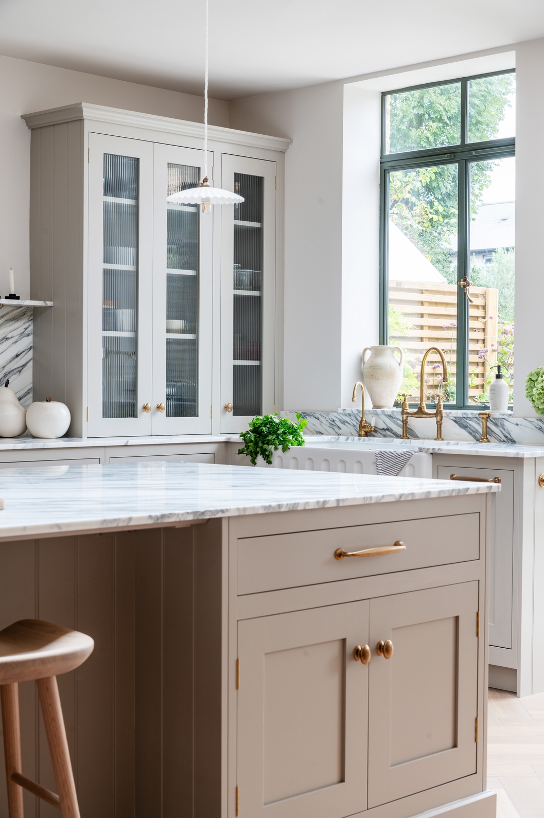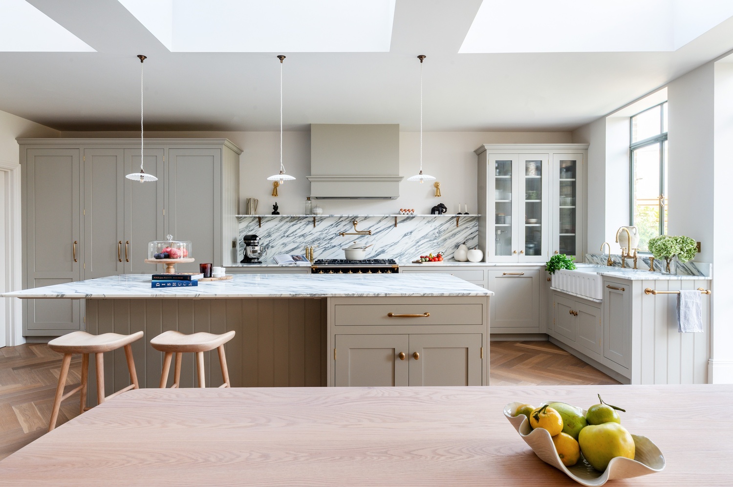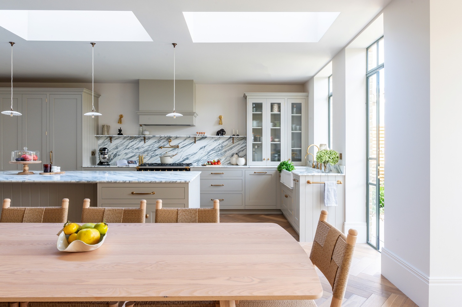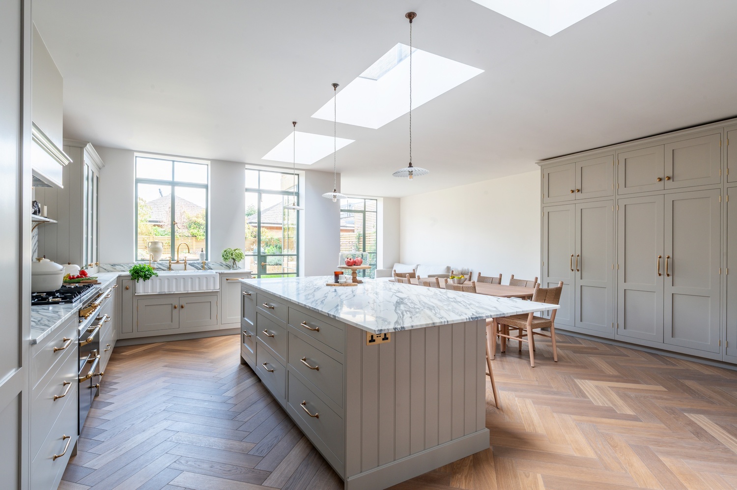 Every material and product was chosen to strike the perfect balance between tradition and contemporary living. After guided visits to our showroom and to Culliford Stone Yard, the clients fell in love with the Arabescato Corchia marble worktops. The elegant veining pairs beautifully with the warmth of the aged oak herringbone flooring, while Armac Martin brassware and deVOL aged brass taps introduce subtle luxury and timeless character.