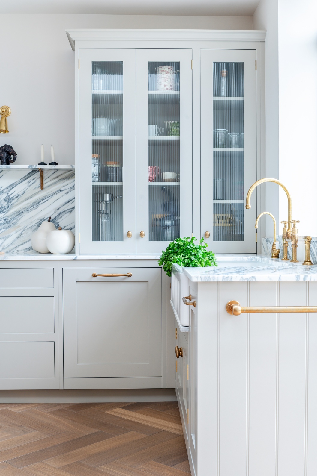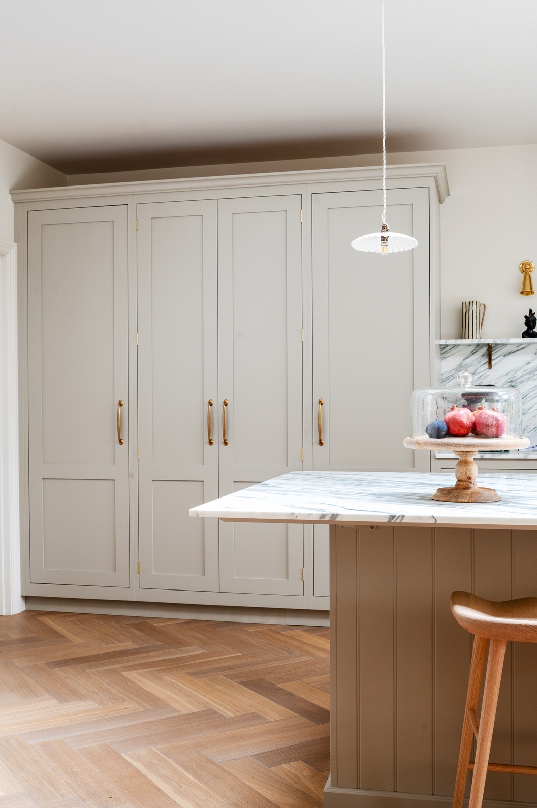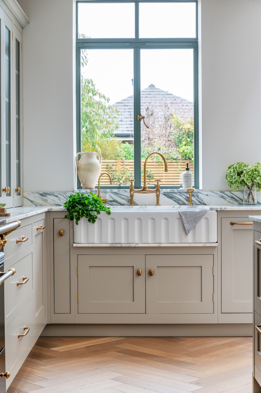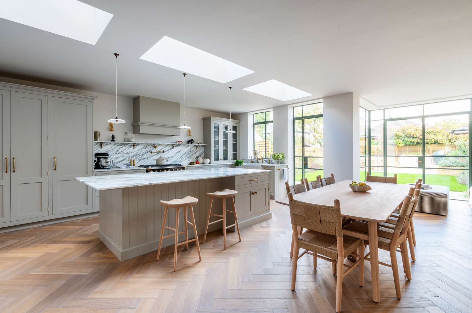 Every material and product was chosen to strike the perfect balance between tradition and contemporary living. After guided visits to our showroom and to Culliford Stone Yard, the clients fell in love with the Arabescato Corchia marble worktops. The elegant veining pairs beautifully with the warmth of the aged oak herringbone flooring, while Armac Martin brassware and deVOL aged brass taps introduce subtle luxury and timeless character.
